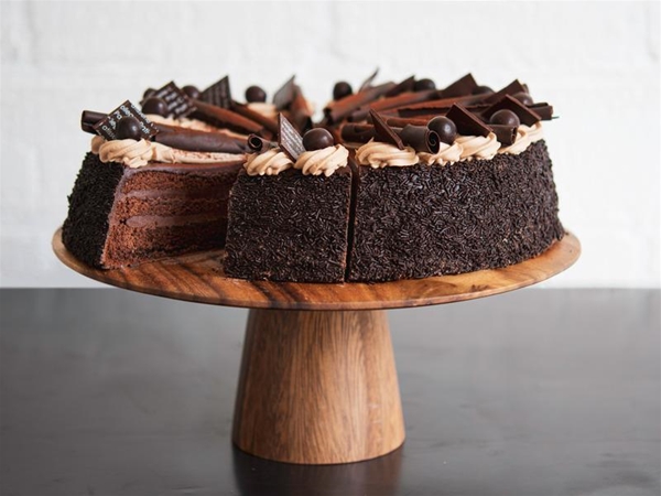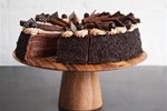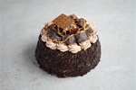 Krachtige chocoladecake met romige chocoladevulling , stukjes brownie en gecarameliseerde pecannoten. Let op: de grote variant heeft een iets krachtigere chocolade-ganache vulling (zie foto 2).