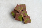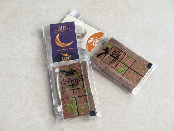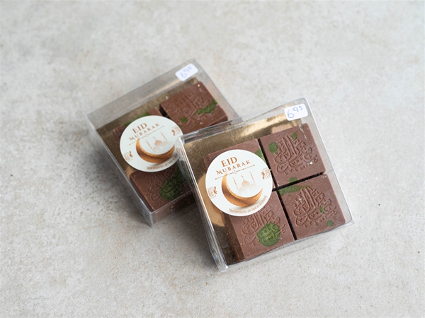 Heerlijke melkchocolade pistache-dubai bonbons, speciaal met Eid Mubarak druk. 4 stuks in luxe doosje of 6 stuks in een zakje.